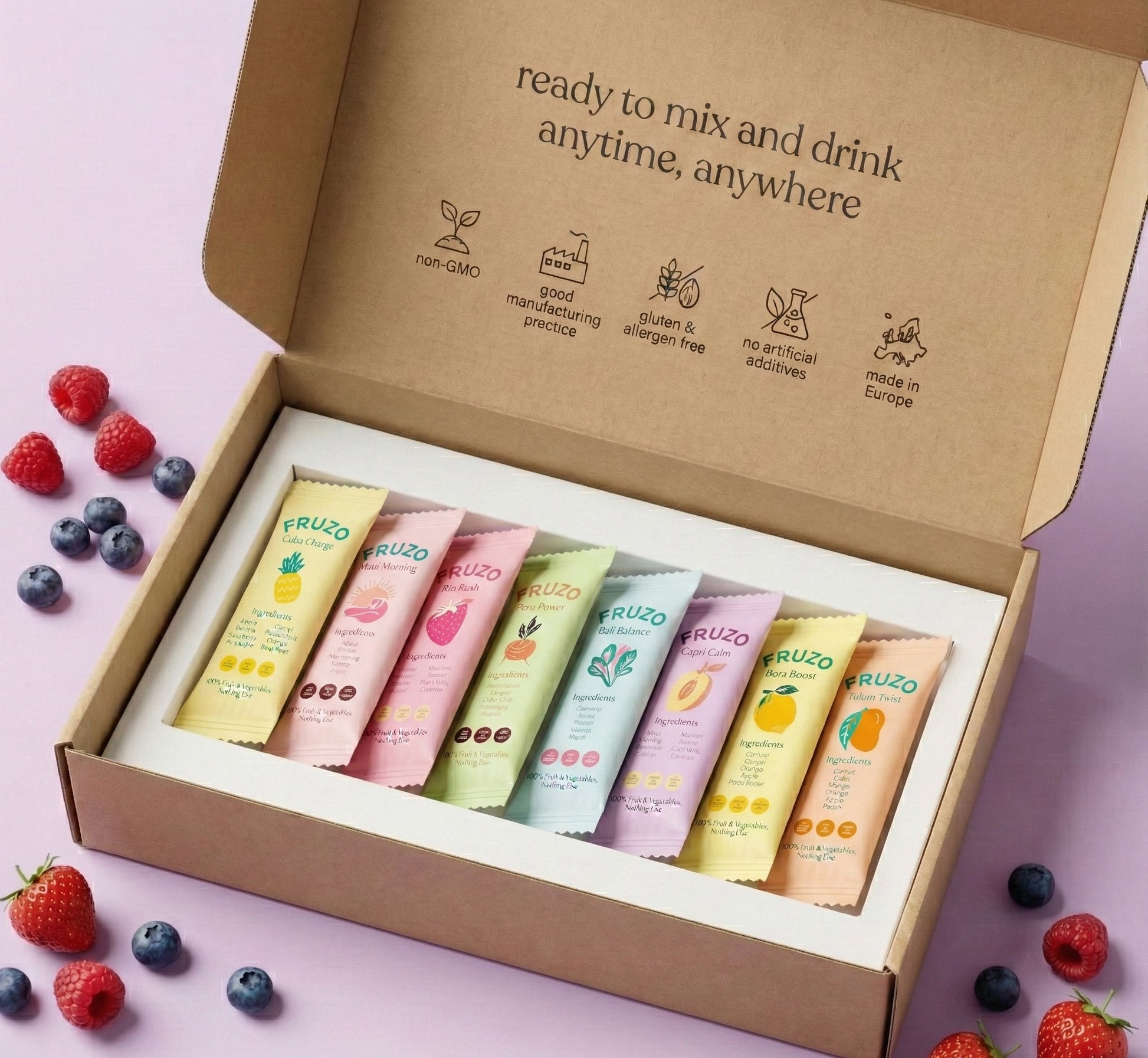 Fruzo ontstond in 2024 uit de wens gezond eten eenvoudig te maken. Na 8 maanden ontwikkelen, 80+ samples, 6 intensieve ontwikkelrondes en ruim 150 proefpersonen bereikten we de optimale balans van smaak en voedingsstoffen. De eerste stap naar een gezondere toekomst.